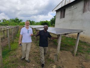 Wir kämpfen uns mehrere Stunden durch den Verkehr. Auf dem Land geht es besser. Wir lassen die Hauptstraße hinter uns und erreichen über unbefestigte Pisten jene von SunErgy elektrifizierten Dörfer Kotto Up, Kotto Nachtigall und Matouke. Drei Anlagen schauen wir uns an. Ihr Zustand ist stark überholungsbedürftig, Batterien sind teilweise nur notdürftig tüchtig gemacht, manche Module sind kaputt. Hier müssen wir also ran. Wir sehen aber auch, dass in Kotto Nachtigall drei unserer neuen Wechselrichter installiert und die alten ELTEC Maschinen überbrückt wurden, somit ist das Dorf wieder vollumfänglich versorgt. In Motouke arbeitet ein weiterer neuer Wechselrichter auf Probe. Das System funktioniert. Jetzt können wir die weiteren Wechselrichter bestellen.