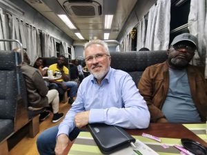 Der Zug, der pünktlich um 17:00 Uhr abfährt, ist quasi ein Oldtimer, aber verfügt nach Umbauten nun über Air Condition, Fernseher mit Videos und Ledersitze. Die Zugfahrt, die uns ca. 15 € pro Person kostet, dauert fünf Stunden. Wir fahren Erster Klasse, eine Hostess bringt uns zum Platz. Die Gleise stammen noch aus besagter deutscher Kolonialzeit. Die Wagons sind nur unwesentlich jünger, aber klimatisiert und mit halbwegs bequemen Sitzen ausgestattet. Die Toiletten funktionieren und sind sauber. Im Zug gibt es nur fünf Weiße, inklusive uns. So fühlt es sich also an, die Minderheit zu sein. Offen gesagt ist so ein Perspektivwechsel sehr zu empfehlen!